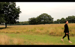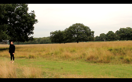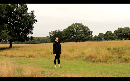Diorama is a contemplative two-screen video work in which a human and an animal swap places and mirror each other’s actions. |