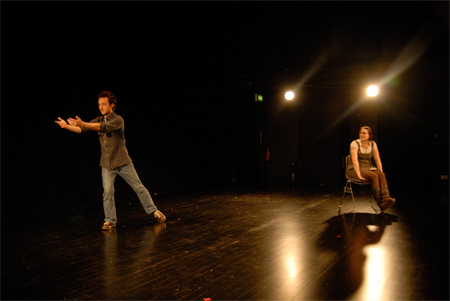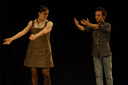 After inviting a member of the audience to sit on a chair on stage, the performer teaches him or her a simple tune that will serve as musical accompaniment to the dance. The piece then begins. Part 1 (solo): the performer executes the dance sequence whilst the spectator watches and sings the musical accompaniment. Part 2 (duet): the performer teaches the dance to the spectator, leading him or her through all the moves and steps. Part 3 (solo): the spectator executes the dance sequence whilst the performer watches and sings the musical accompaniment.